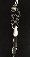 Handmade pendulum made with an oval shaped vintage finding with black star onyx on one side and white star onyx on the other. Chain is 5" long. The hanging crystal came from a chandelier.