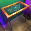 This one of a kind, custom made mahogany and glass table has streamlined gazelle like legs and intricate cut out celestial forms floating under the glass. It measures 27" x 17" x 30" tall. Due to size and fragile glass, this piece is local pick up only.